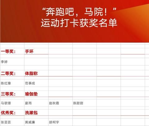 本次活动采取线上运动群内打卡的形式,大家可以根据自己的兴趣来选择跑步、瑜伽、健身操、跳绳等类型的运动方式,在规定的期限内分享运动的视频、照片、APP截图等凭证,累计打卡10天以上即可根据相应的运动时长获得不同的礼品。活动期间,共有24名同学参与打卡活动,大家在微信群内相互交流运动健身的经验和心得,互相监督、互相鼓励,各式各样的运动展现了马院学子热爱生活、健康向上的青春活力。经过十五天的努力,最后有十位同学坚持进行运动打卡且累计超过十天,在强身健体的同时也收获了精美的礼品。